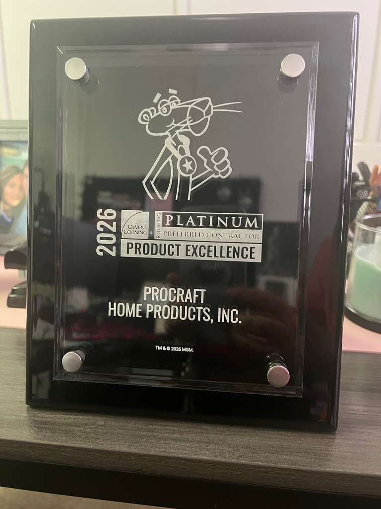 In 2026, Pro Craft Home Products was honored with the Owens Corning Product Excellence Award, a recognition given to contractors who consistently deliver outstanding quality and performance. This award reflects the company’s commitment to using premium roofing materials, following strict installation standards, and ensuring long-lasting results for homeowners. As an Owens Corning Platinum Preferred Contractor, this achievement further highlights Pro Craft Home Products’ dedication to craftsmanship, reliability, and customer satisfaction on every project.
